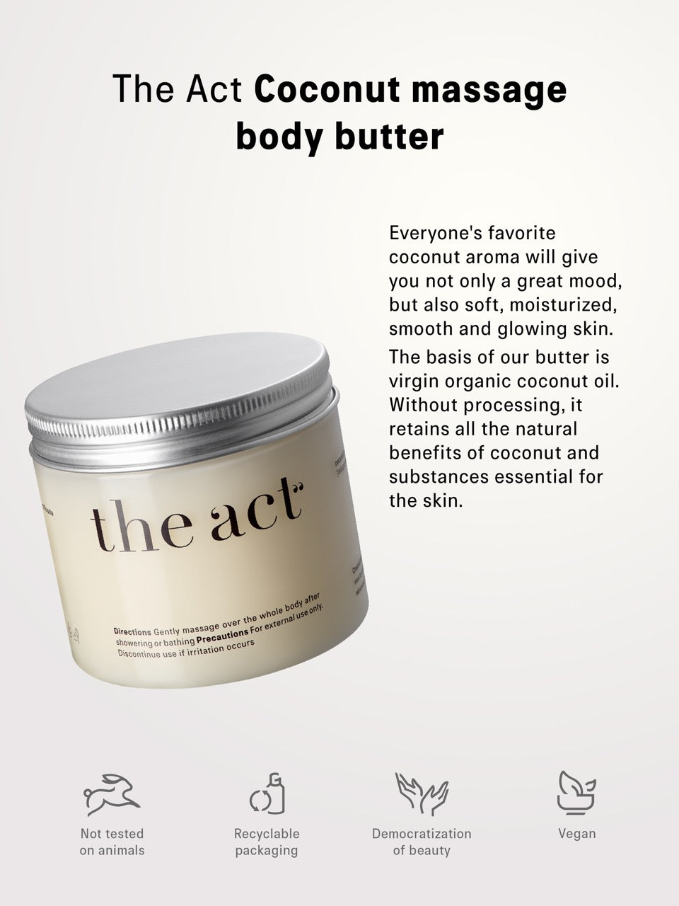 أساس زبدتنا هو زيت جوز الهند العضوي البكر. بدون معالجة، يحتفظ بجميع الفوائد الطبيعية لجوز الهند والمواد الأساسية للبشرة.
